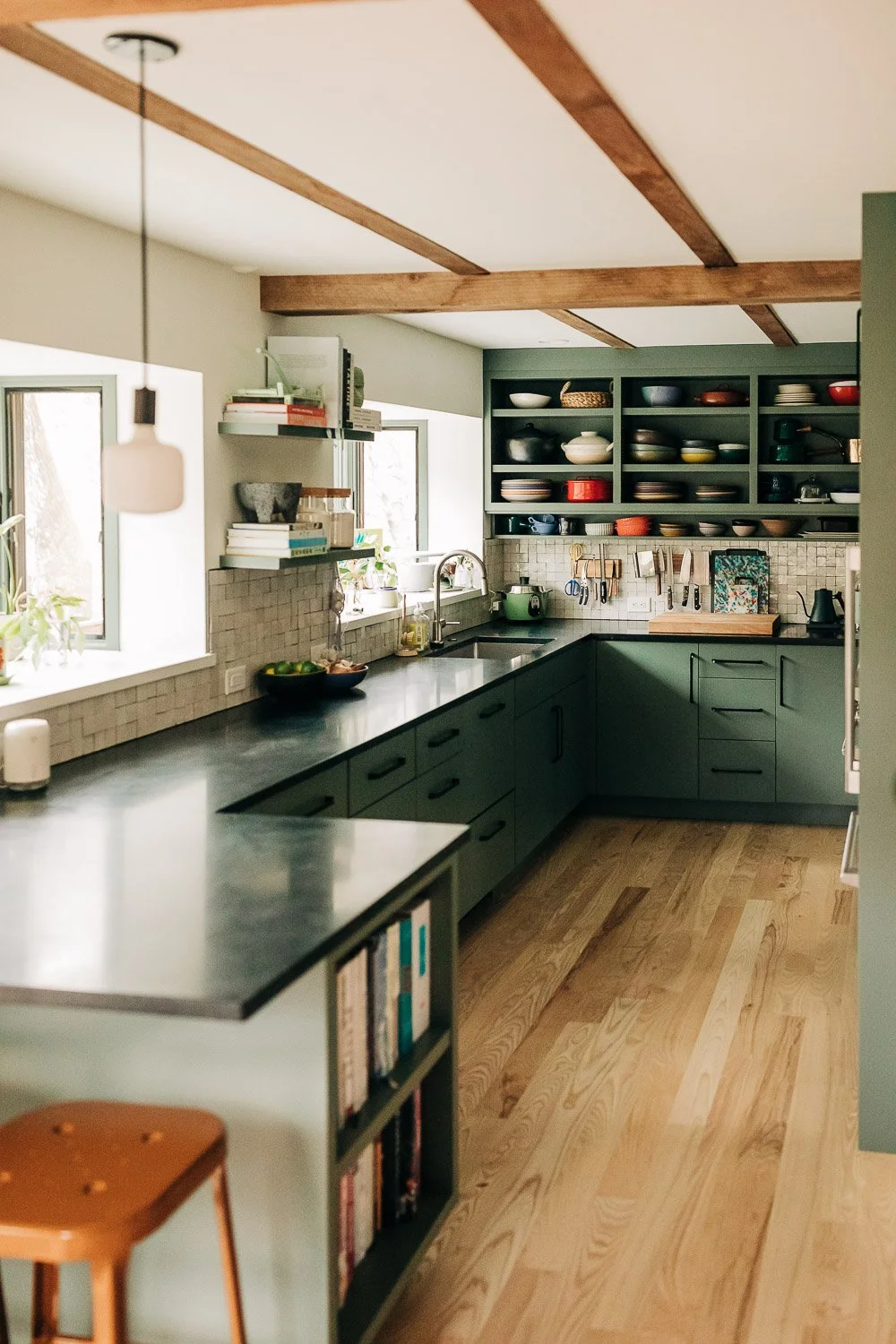 In the kitchen, thoughtful adjustments to the layout made room for a new main-level bathroom while still maintaining an open and highly functional cooking space. Custom cabinetry integrates a double-drawer dishwasher, concealed behind lacquered green fronts, allowing for smaller, more efficient loads without interrupting flow. A gas range with a pot filler, open shelving for cookbooks, and a bay window for plant life all contribute to a kitchen designed for daily use and enjoyment.